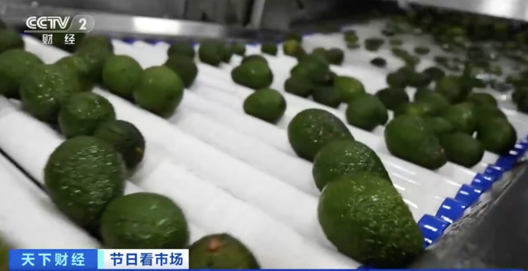 从树上采摘的牛油果被运到分拣中心,智能选果机可将果实分类,并给果实清洗、杀菌、保鲜等,此外,还能剔除表面有破裂、蛀虫等瑕疵的果子,筛选出“质量果”。
