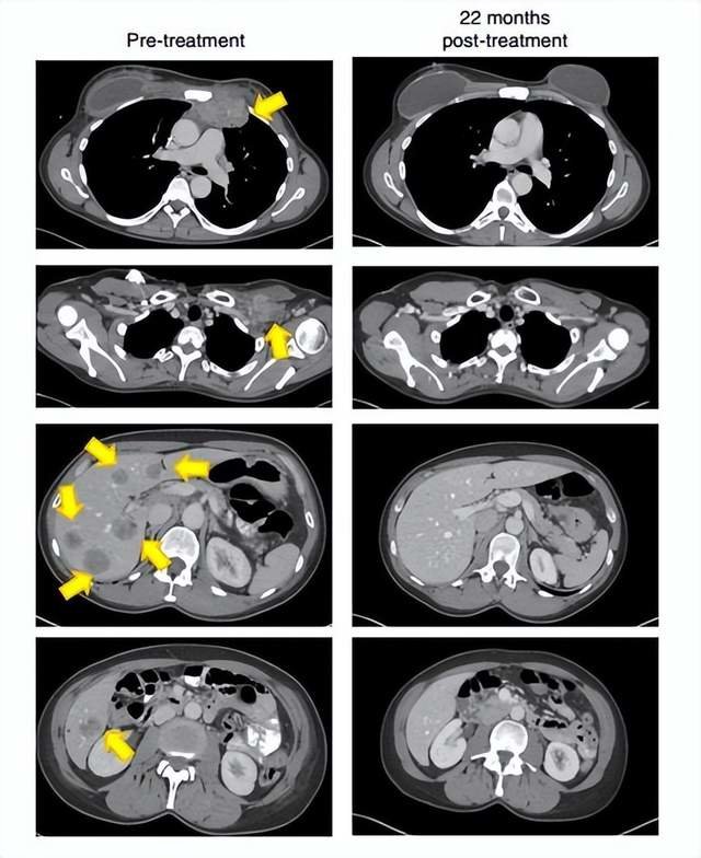 ▲22个月后,这名患者的肿瘤(黄色箭头)消失得无影无踪(图片来源:《Nature Medicine》)