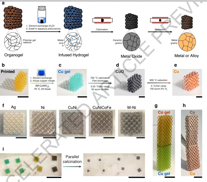 图 水凝胶注入增材制造工艺流程示意图。a、HIAM流程示意图。PEGda-/DMF基的3D打印有机凝胶结构在浸出个光活性化合物、溶剂交换和注入适当的水前驱体后转化为注入水凝胶副本。随后在空气中煅烧形成金属氧化物结构,在形成气体时还原为金属。b-e,铜金属的HIAM工艺。f,通过HIAM制造的其他金属包括Ag和Ni,二元合金CuNi,高熵合金CuNiCoFe和耐火合金W-Ni。g,八面体晶格,一端注入Cu(NO3)2,另一端注入Co(NO3)2。经过煅烧和还原,Cu/Co凝胶转变为h,一种Cu/Co多材料。i,几种不同注入凝胶的平行煅烧。比例尺:b、c、5 mm;d-f 1毫米;g, 1厘米;h, 2毫米;i,2厘米。