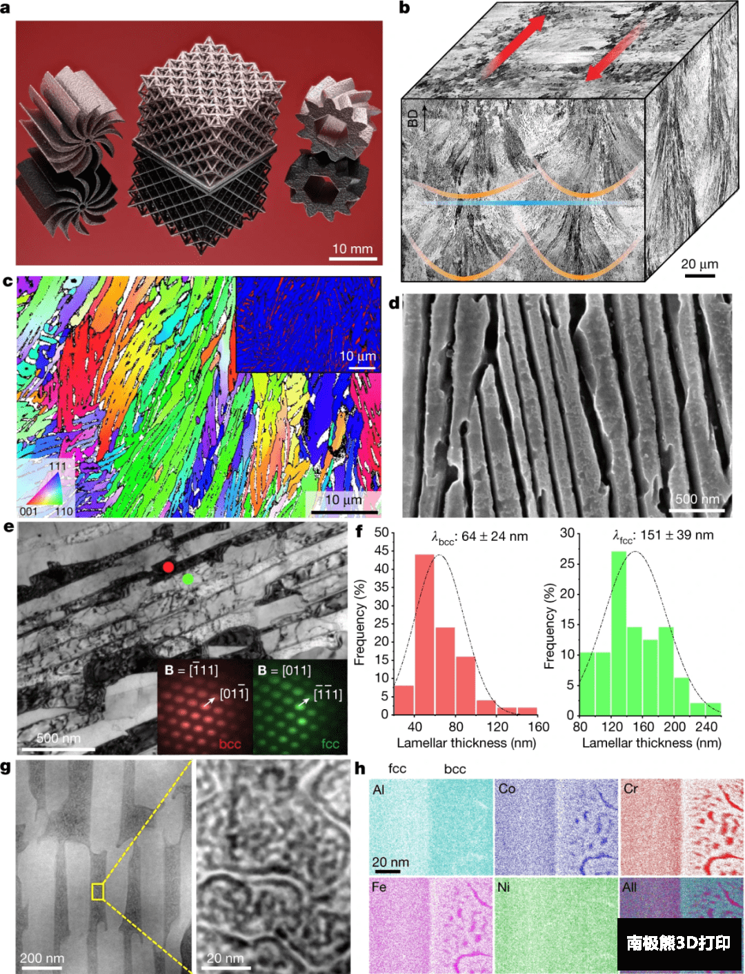 图.增材制造的AlCoCrFeNi2.1 EHEA的微结构。a、印刷散热风扇、八位晶格(支柱尺寸约300微米)和齿轮(从左至右)。b、AlCoCrFeNi2.1 EHEA的三维重建光学显微照片。层间边界、熔池边界和激光扫描轨迹分别用蓝线、橙线和红箭头表示。构建方向(BD)是垂直的。c、印刷的AlCoCrFeNi2.1 EHEA的横截面EBSD IPF图,显示了放大的局部区域,其中相邻的纳米片状共晶团表现出不同的结晶取向。为了更好地显示更精细的体心立方纳米片层,插图显示了双色EBSD相位图,面心立方片层为蓝色,体心立方片层为红色。值得注意的是,由于bcc纳米片层的厚度很小,接近EBSD的分辨率极限,所以它们是指数不足的(参见补充图3双相纳米片层共晶团的形态)。d、纳米层状结构的二次电子显微照片。e、bcc和fcc纳米片晶的明场TEM图像(分别由红点和绿点表示),插图显示分别倾斜于区域轴(B)的bcc和fcc的PED图案。f、AlCoCrFeNi2.1 EHEA中bcc(左)和fcc(右)片层的片层厚度分布。g、HAADF-STEM图像显示了体心立方片层内的调制纳米结构。h、100×78×5 nm3截面中元素分布的APT图,中心为fcc/bcc界面。纳米尺度的富Ni–Al和富Co–Cr–Fe区域显示了体心立方片晶内的化学波动。
