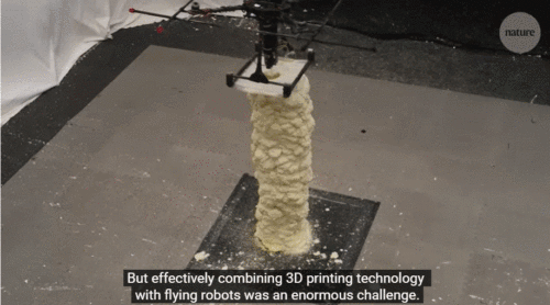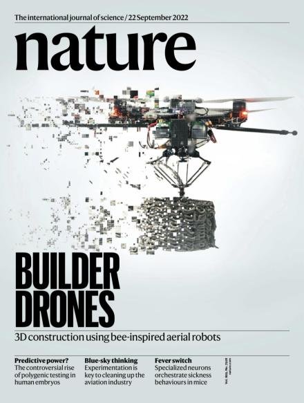 2022年9月,一项3D打印研究成果登上了《Nature》杂志封面,伦敦帝国理工学院和欧洲空间局(Empa)研究人员创建了一个以蜜蜂为灵感的3D打印无人机舰队。整个舰队由2种无人机组成:一个是打印建造的BuilDrones,另一个监督和评估工作的ScanDrones。它们将用于难以进入或危险地区的建筑建造,还可以帮助灾后救援建设。
