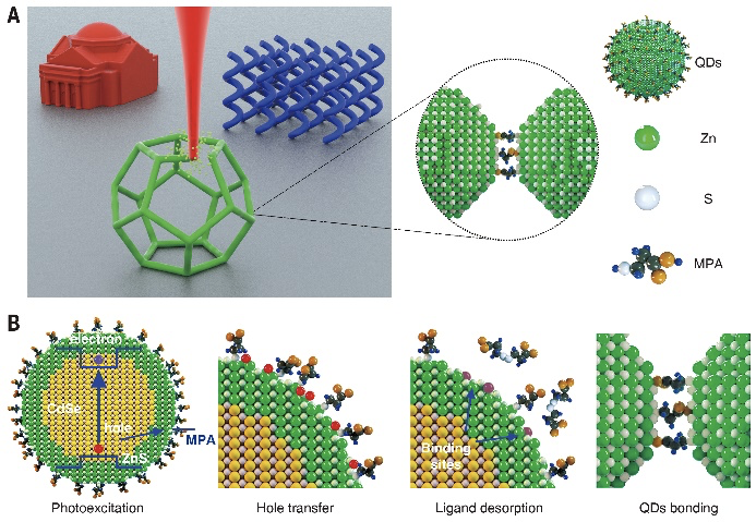 该成果发表在《科学》(Science)期刊上,题为“光激发诱导化学键合实现半导体量子点3D纳米打印”(3D nanoprinting of semiconductor quantum dots by photoexcitation-induced chemical bonding)。