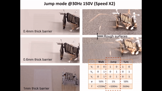研究人员在视频中展示了微型机器人的运动模式,转向模式,跳跃模式,受到攻击之后转向,过S弯以及砂石路面上的行走。