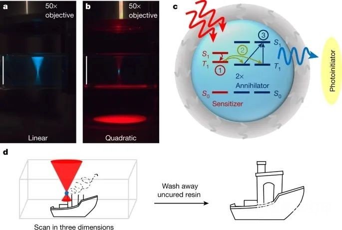 2022年4月,美国斯坦福大学的Daniel N. Congreve等研究者,在小于4毫瓦的连续波激发下,实现了三重态融合上转换的体积打印。相关论文以题为“Triplet fusion upconversion nanocapsules for volumetric 3D printing”于发表在Nature上。