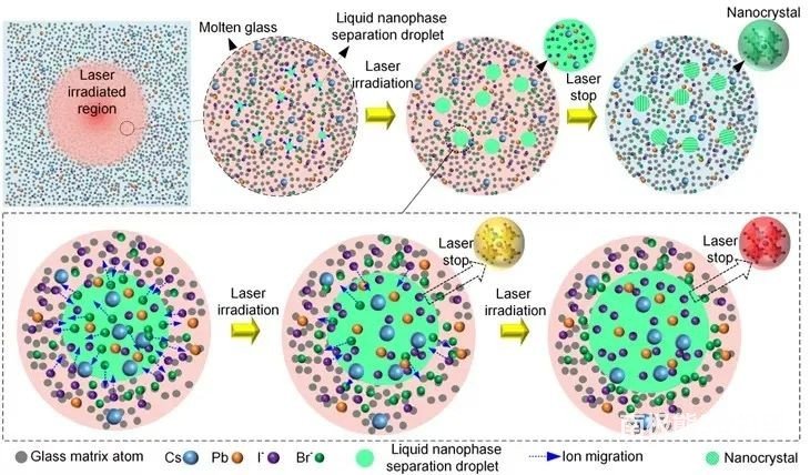 近年来,钙钛矿成为光学领域的“新贵”,这种纳米级别的半导体材料,由于其特殊的发光性能,在显示及照明等领域展现出巨大的应用潜力。具有不同组成元素的钙钛矿纳米晶具有不同的半导体带隙宽度,在紫外光或者蓝光照射下可以发出不同颜色的光。研究团队通过精心设计及一系列实验发现,超快激光3D直写技术可以在无色透明玻璃内实现带隙可控、任意形状的三维半导体纳米结构。“利用激光直接改变纳米晶的发光颜色,实现从蓝光到红光连续可调,是我们在该领域的重大突破之一。在这之前,在材料内部写入发光连续可调的微纳结构几乎是超乎想象的。”谭德志表示。