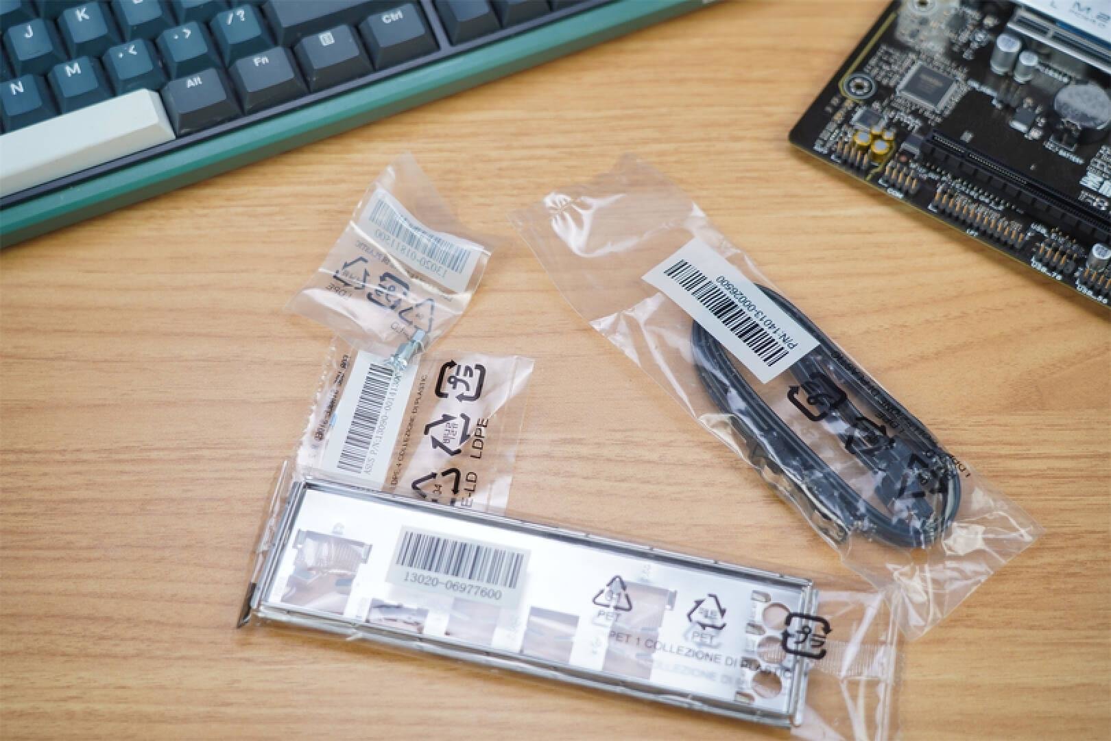 最后看看其配件, i/o 挡板之外, sata 数据线两条,说明书,两个 M.2 免工具安装套件。