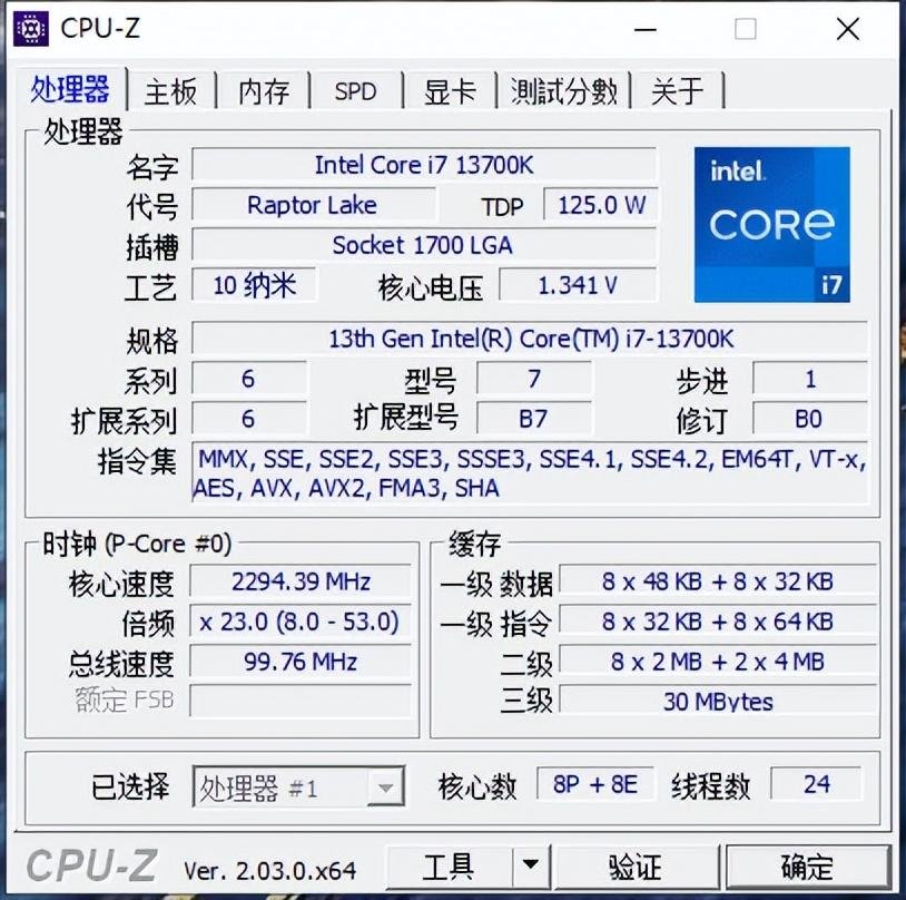 用CPU-Z查看一下13700k详细参数,10nm工艺制程,TPD为125W,8核24线程,L3缓存达到了30MB。