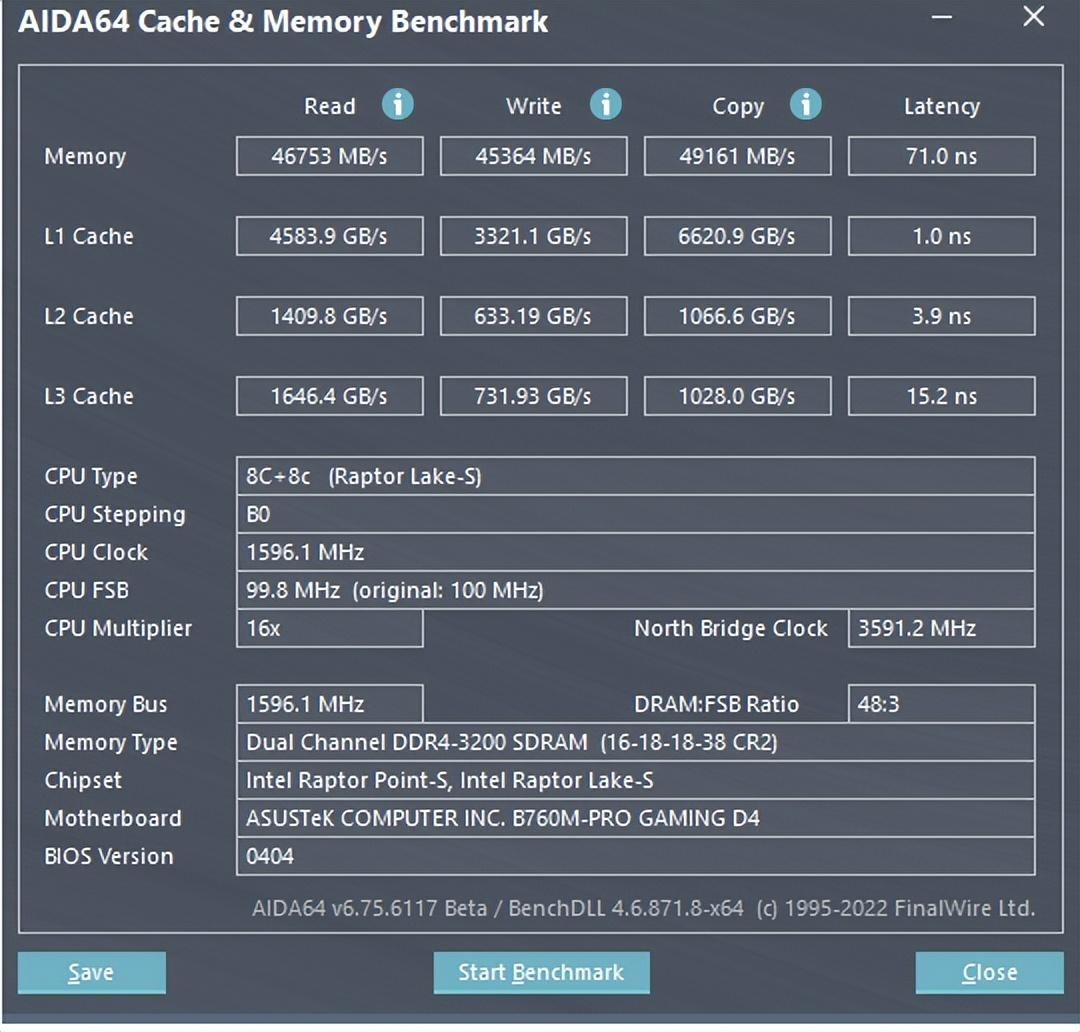 没有超频,这里标注重点,哈哈。实测内存读取46753MB/s、写入45364MB/s、复制49161MB/s,内存延迟71.0ns。读写速度快但是延迟稍微有点高,不过对于D4内存来说,这个表现应该算不错的了。