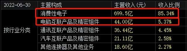 数据显示,截至2022上半年,消费性电子、电脑互联产品及精密组件两块业务分别占立讯精密比重为85.34%、5.37%,合计贡献了90%以上收入。