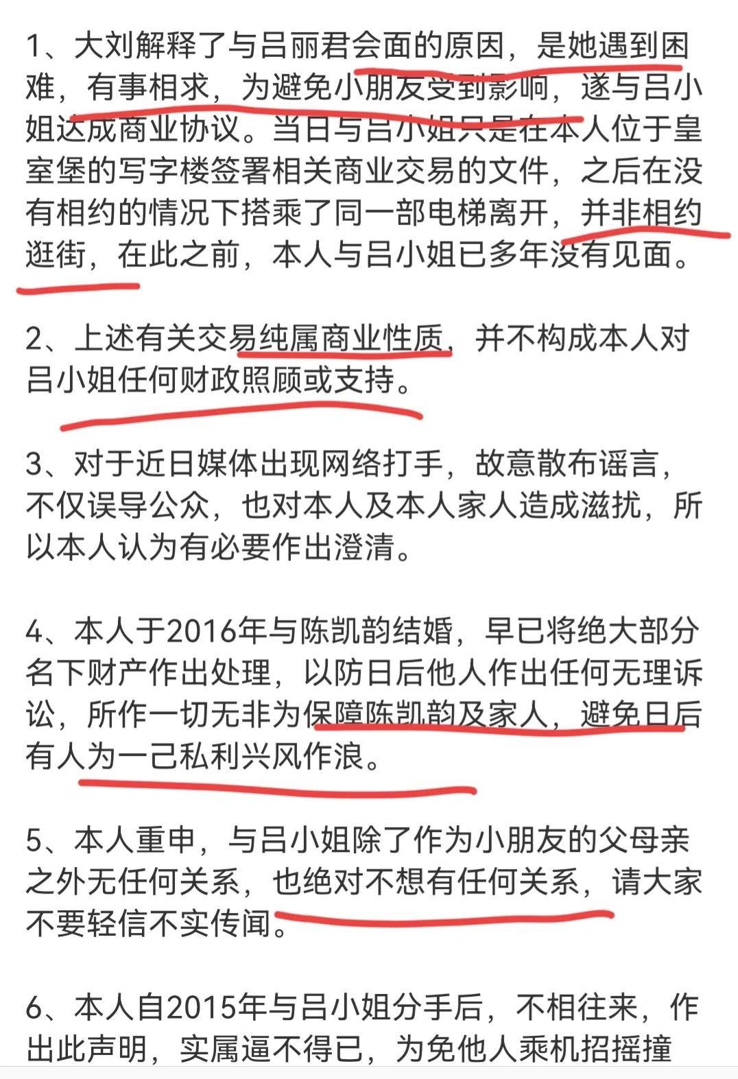 不会复合,只是单纯孩子父母关系,不要让外界任何人有非分之想。与吕丽君见面,只是因为她遇到困难,签署的是商业交易文件,并非相约逛街,他没有对吕丽君有任何财政上的照顾……