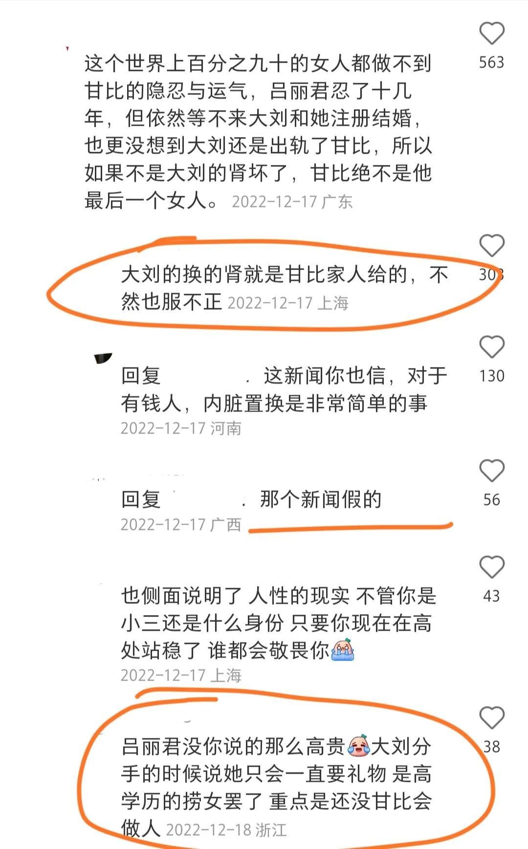这个说法,在民间流传甚广,版本要么是刘銮雄的肾,是甘比妈妈免费移植给他的,他对甘比好,是为了报恩;要么就说是甘比家里其他人,为了女儿能上位,献出了自己的腰子……