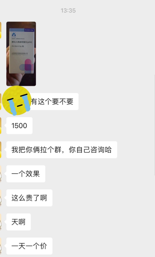 “静注人免疫球蛋白的价格水涨船高,一天一个价。原本2.5克一瓶的价格是300到400多元,昨天涨到了1300元,今天倒卖的价格直接涨到了2200元。”不少网友在社交平台上分享了购买静注人免疫球蛋白的经历。
