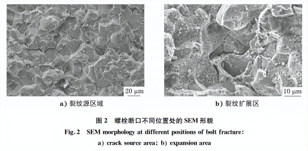利用扫描电镜(SEM)观察螺栓断口的 SEM 形貌。由图2可见:断口中裂纹源区域呈准解理 开裂和沿晶开裂的特征,可见明显的二次裂纹;螺 栓裂纹扩展区可见蜂窝状形貌,在晶界上可见明 显的蠕变孔洞。