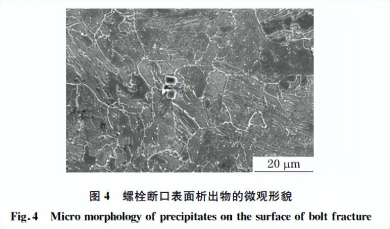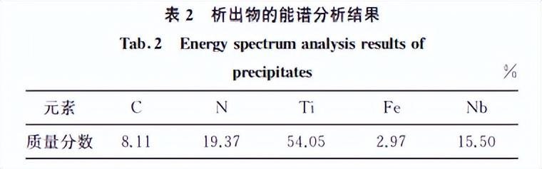 进一步放大观察,发现组织中可见块状析出物, 其截面呈规则的四边形,如图4所示。对析出物进 行能谱分析,结果见表2,该析出物主要由碳、氮、 铌、钛、钒、铁组成,推测该析出物为氮化物。