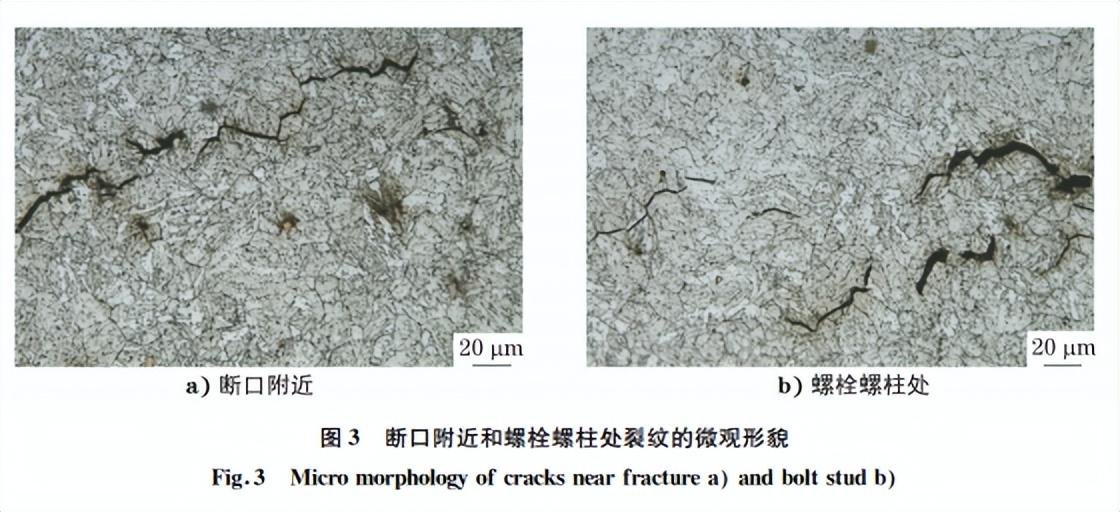 在螺栓断口附近及螺栓螺柱取样,观察裂纹的 微观形貌。由图3可见:在螺栓断口附近可见沿晶 界扩展的二次微裂纹以及在螺栓螺柱沿晶界扩展的 微裂纹。