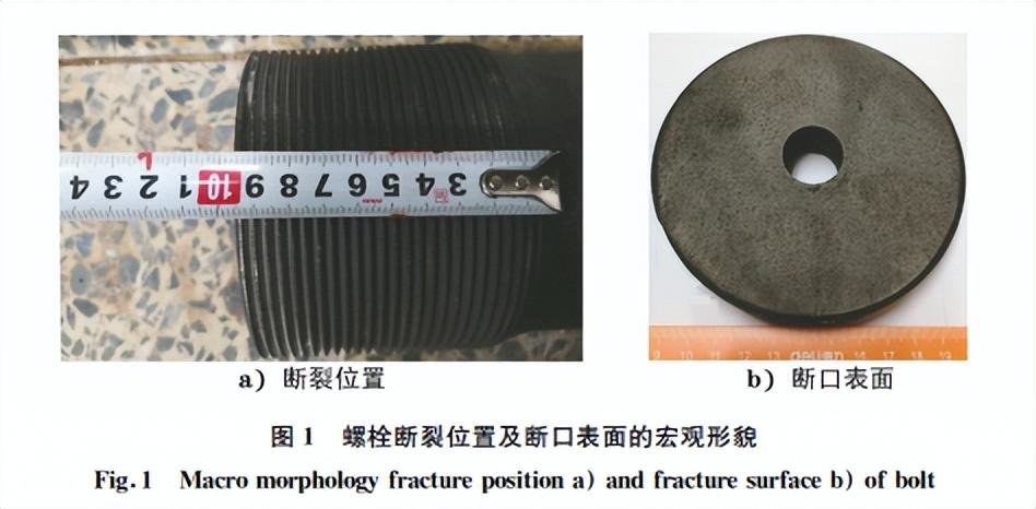 该电厂高中压缸由74支螺栓紧固,采用规格为 ϕ120mm×1530mm的双头螺柱,设计工作温度 为537℃,螺栓材料为20Cr1Mo1VNbTiB钢。该 双头螺栓的螺纹长度约为180mm,螺栓的断裂位 置位于螺纹长90mm 处,如图1a)所示。由图1b) 可见:螺栓断口平整,断口被氧化后呈灰黑色,螺纹 断面垂直于螺栓轴向;从裂纹扩展的放射状条纹特 征来看,裂纹源位于外螺纹根部,裂纹从螺栓外表面 向心部扩展,裂纹源部分区域因磨损而被破坏,瞬断 区位于螺栓中心圆孔处。