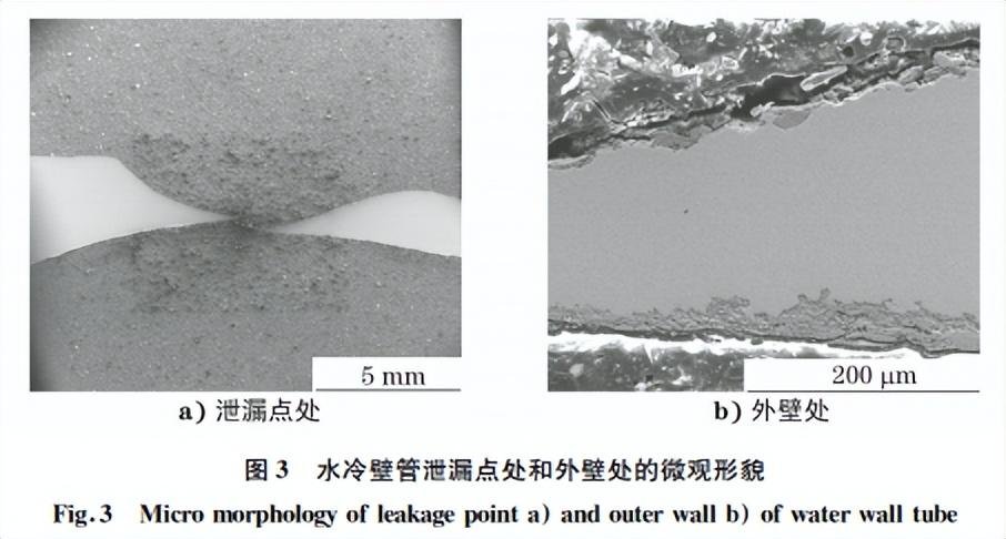 摘 要:某水电厂锅炉水冷壁管发生泄漏,通过宏观观察、化学成分分析、扫描电镜分析、能谱 分析以及显微组织观察等方法,分析了水冷壁管泄漏的原因。结果表明:水冷壁管发生泄漏的原因 是高温烟气中的腐蚀性介质渗入墙体内部,导致水冷壁管发生腐蚀,管壁减薄,最终发生泄漏。