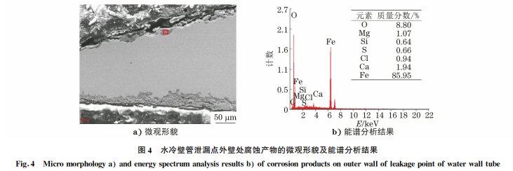 在水冷壁管泄漏点处截取试样,经镶嵌、磨抛 后在显微镜下观察,泄 漏 点 处 的 微 观 形 貌 见 图 3a),从形貌可判断其穿孔是从管道外壁向内壁扩 展。进一步放大外壁处,可见其表面存在腐蚀产 物,见图3b)。对腐蚀产物进行能谱分析,结果见 图4,检测到有较高含量的硫和氯等腐蚀性元素, 以及钠、镁、钾和钙等元素。判定是由硫和氯元素 引发电化学反应从而使材料发生腐蚀,从而穿孔 的[3]。