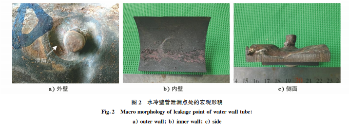 水冷壁管泄漏点处的宏观形貌见图2a),可见泄 漏点位于销钉附近的管壁凹陷处,该区域附近呈深灰 色。通过机械加工方法截取泄漏点处试样,其内壁的 宏观形貌见图2b)。对试样侧面进行观察,外壁可见 凹陷,内壁未见异常,管壁整体发生减薄,见图2c)。