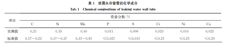 从泄漏水冷壁管上截取试样进行化学成分分析, 结果见表1。由表1可见,水冷壁管的化学成分符合 GB/T5310-2017《高压锅炉用无缝钢管》的技术要求。