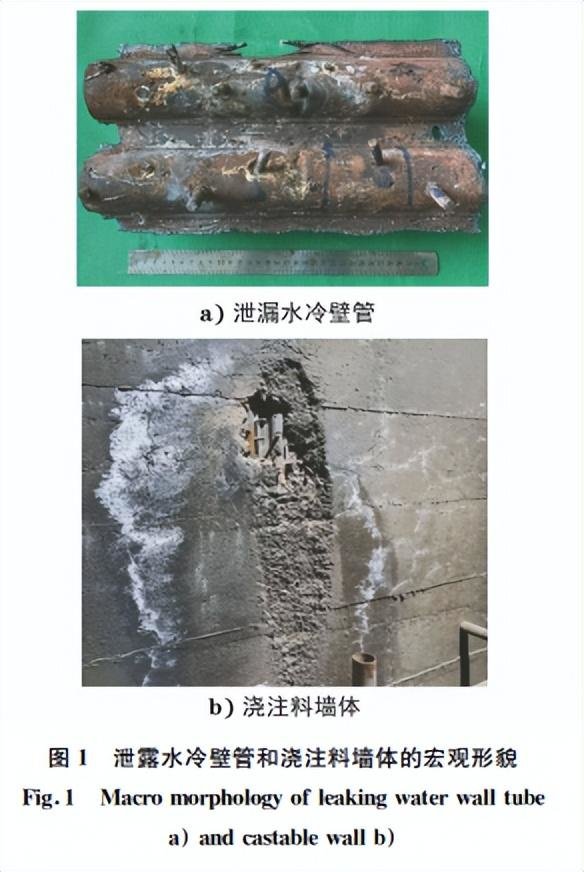 充足的电力生产是国民经济发展的主要保证。 我国炭资源丰富,长期以来从火力发电为主,使得火 力发电对于电力生产尤为重要。锅炉作为火力发电 厂的三大机组之一,其安全性和稳定性对电力生产的 影响极大[1]。水冷壁管由许多并联的管子组合形成 蒸发受热面,一般安装在锅炉炉膛内壁。水冷壁管的 主要作用是吸收炉膛中高温火焰或烟气的辐射热量, 通过热传导使管内的水产生蒸气或变成热水,以此来 降低炉墙的温度,达到保护炉墙的目的[2]。某水电厂 锅炉水冷壁管发生泄漏,其材料为20G钢,管外部由 浇注料覆盖,管内部为除盐水,温度约为280℃,自然 水循环,外部环境为1000℃的高温烟气,水冷壁管 采用竖直安装,该次泄漏为二次泄漏,管道发生泄漏 的位置为向火面,水冷壁管的宏观形貌见图1a),浇注 料墙体宏观形貌见图1b)。笔者通过宏观观察、化学 成分分析、扫描电镜分析、能谱分析以及显微组织观 察,对水冷壁管泄漏的原因进行分析。