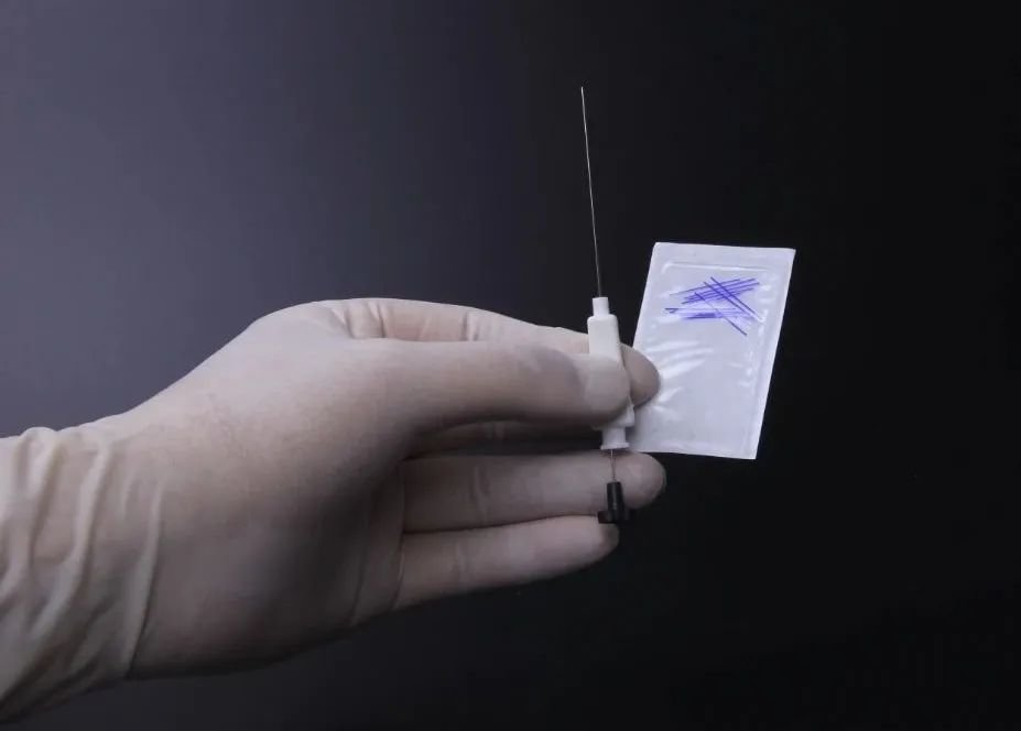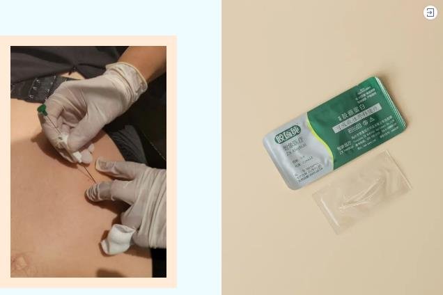 3、选星状神经节位置,选智象胶原蛋白线1号线,2cm,用五香排毒中药液浸泡后埋线,局部消毒后,将1号肠线穿入11号针中,从大椎穴向两侧平刺埋线,拔出针后挤出少量血,消毒后贴好创可贴,保护针眼24小时。