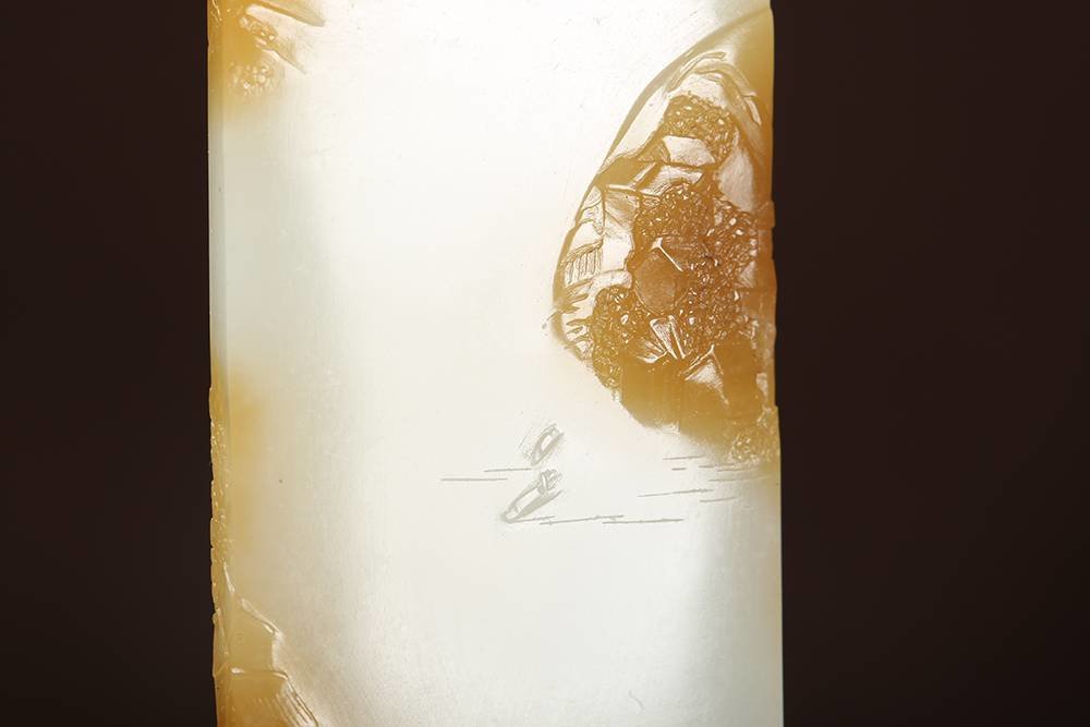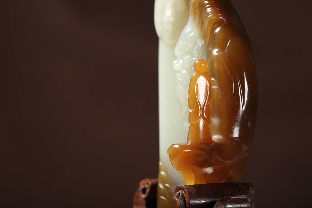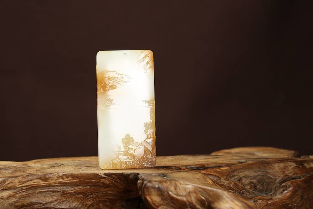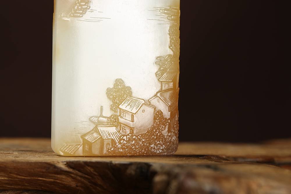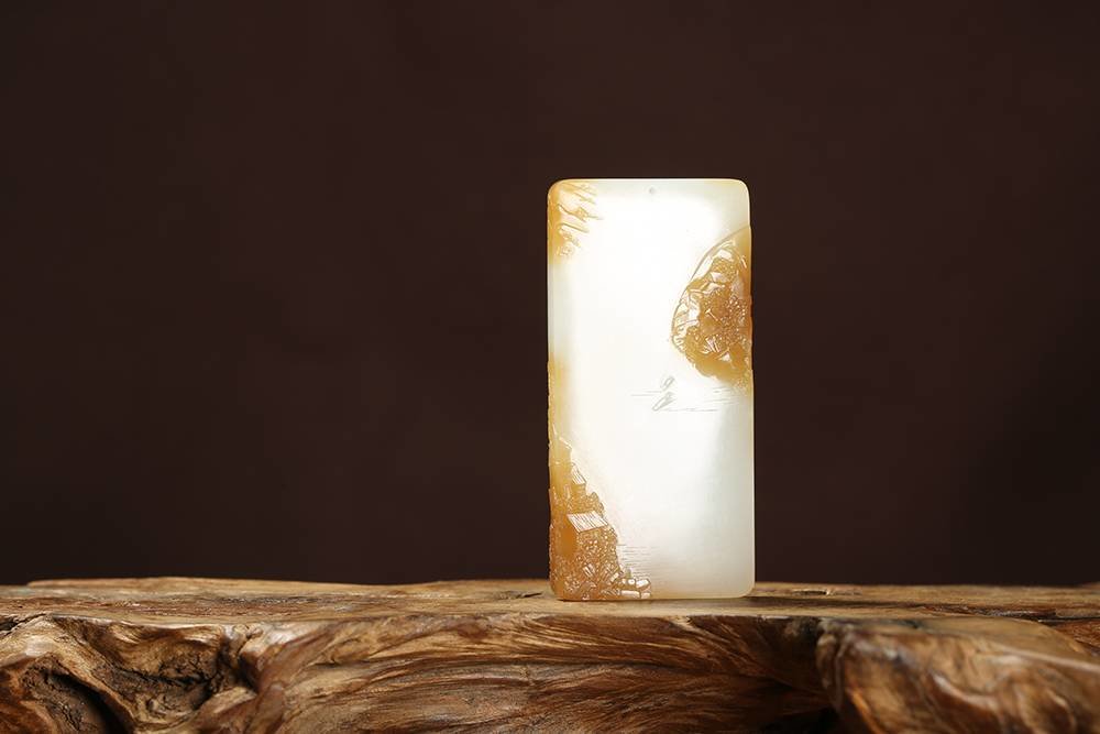 江流天地外,山色有无中,以上乘且末糖料为材,细度过肉眼,糖色干净,白肉凝润,以三角构图法,俏糖色巧做亭阁楼台、松林隐居,呈包裹之感,白肉留白,以现水面之静雅,近大远小,精巧于方寸之上,雕琢出亦真亦幻的山水意境。