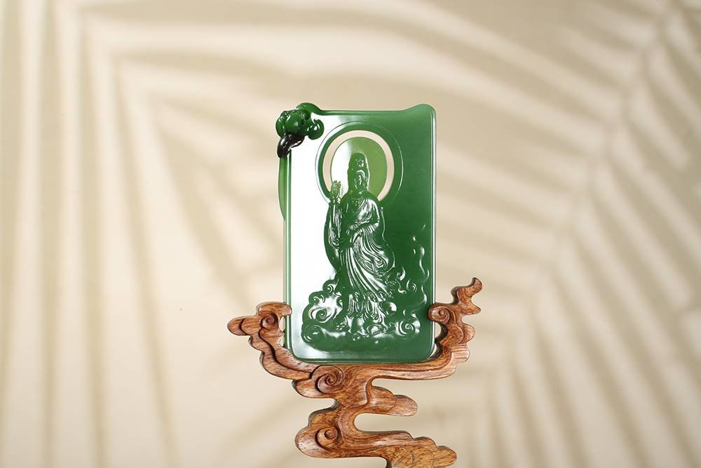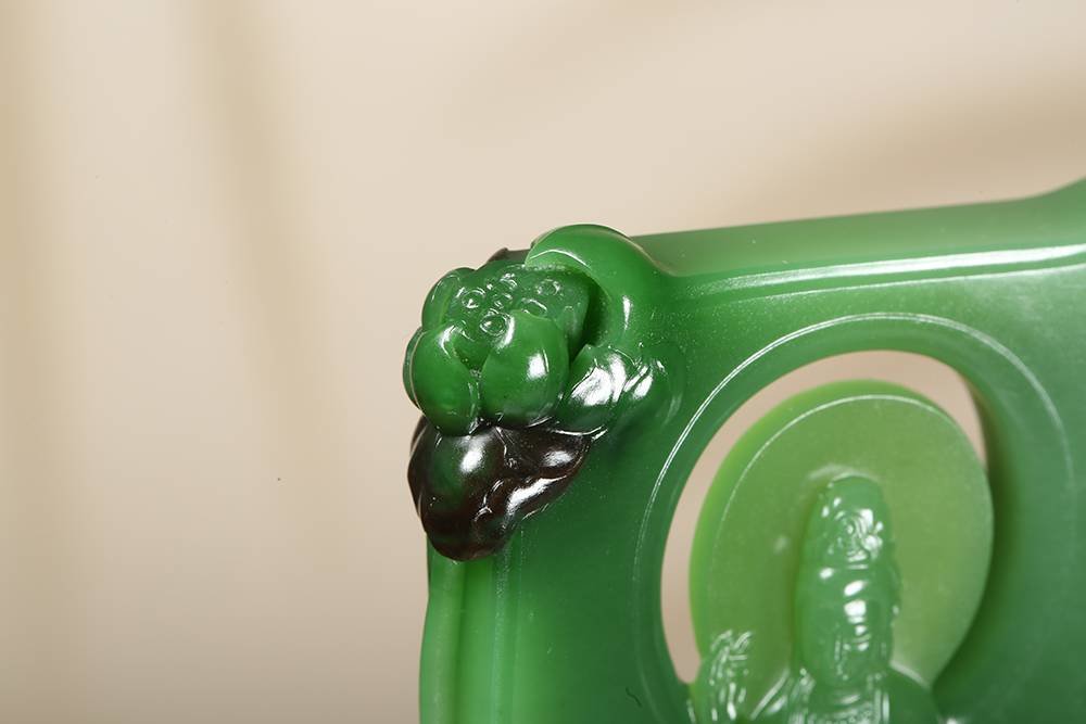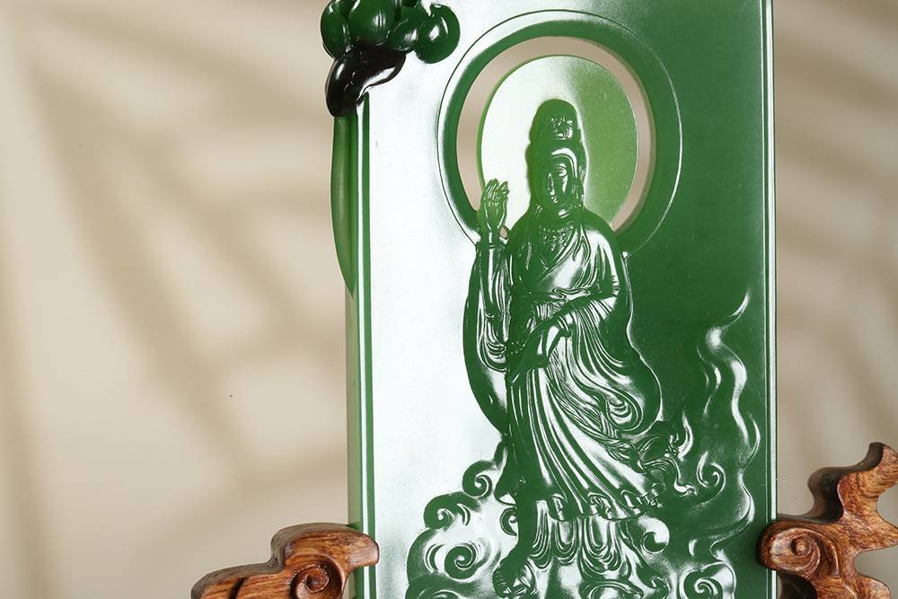凝润俄碧为材,玉质干净,碧色晕染均匀自然,巧琢观音插牌,观音玉面自在脱俗,眉若晓月,双目微合,俏色圆雕聚黑处,巧做莲花,尽显立体感,背部点缀莲花纹,前后呼应,透气感十足,可置于书案之上,亦可收藏观赏。