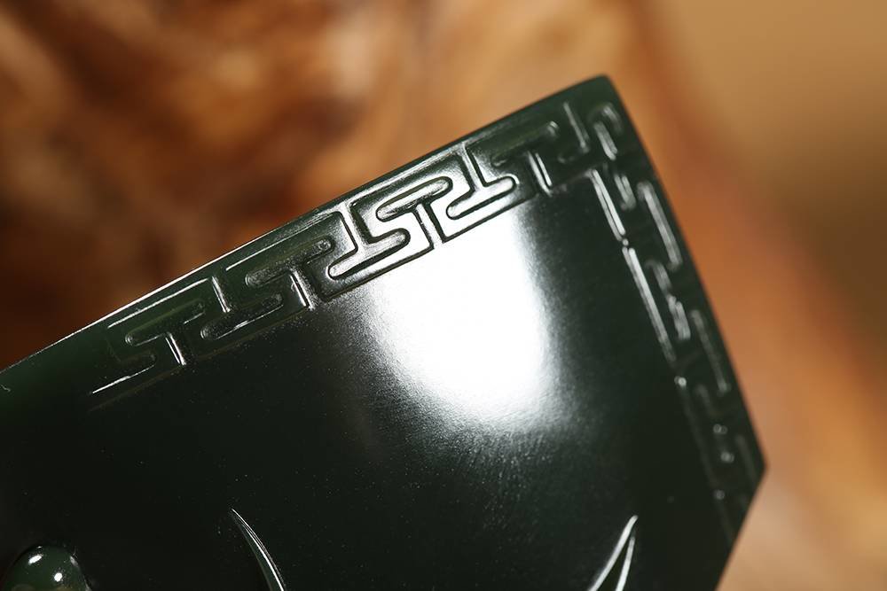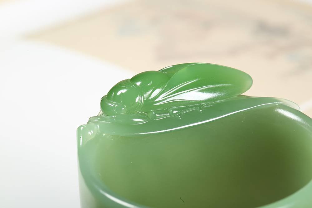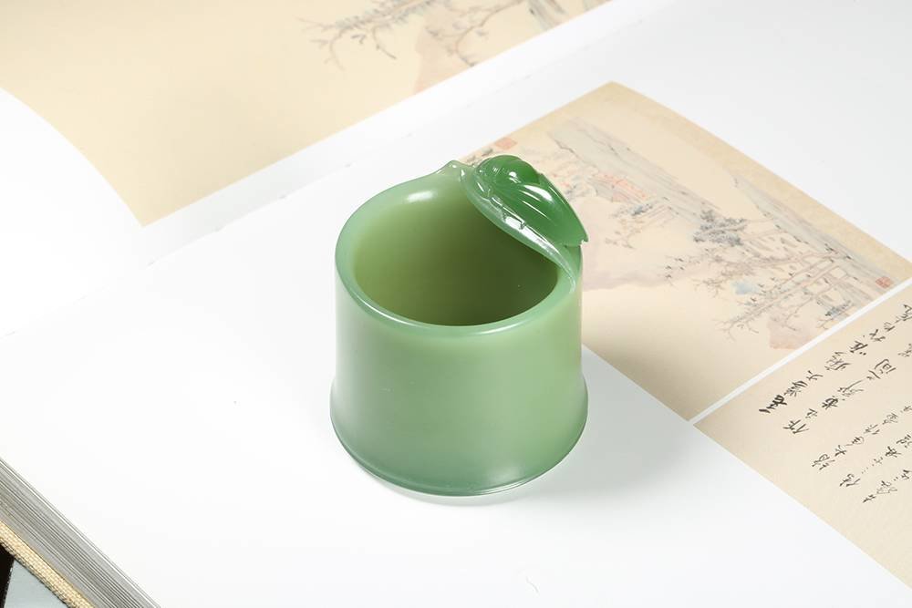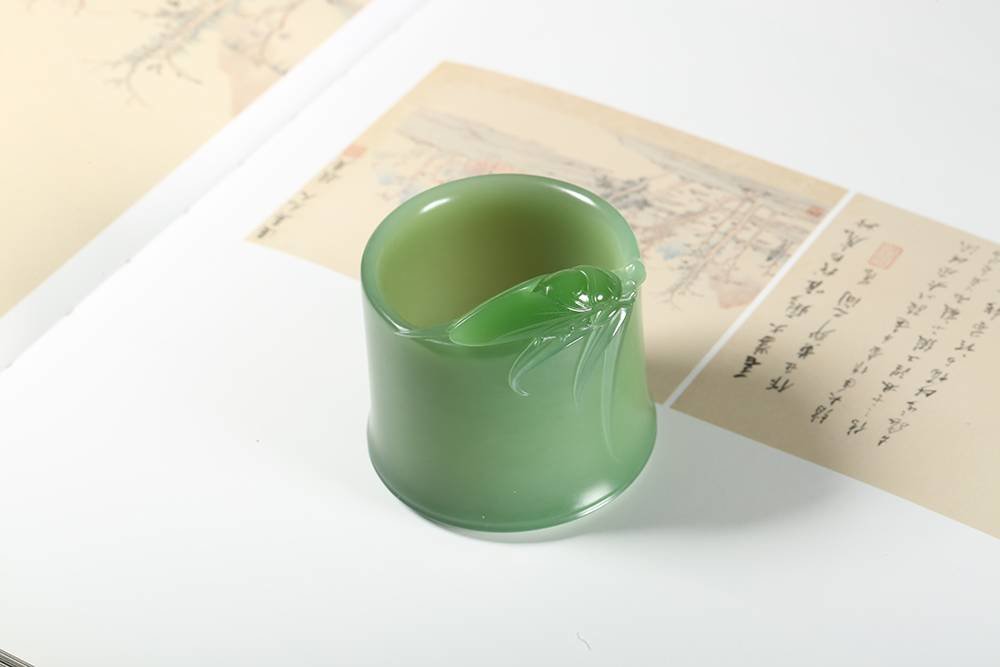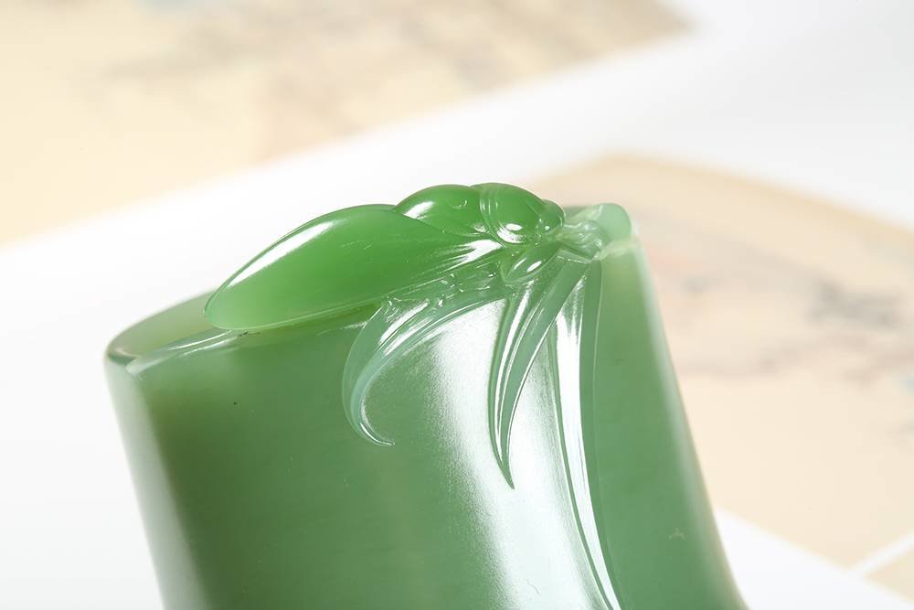 以优质俄碧为材,玉质凝糯,玉色淡雅,粉青巧做竹节杯身,杯型稳重,极具设计感,顶端俏苹果绿玉色,雕琢玉蝉趴伏于杯沿处,灵动具象,纯净亮眼,整件作品压手感十足,可日常使用,亦可收藏把玩。