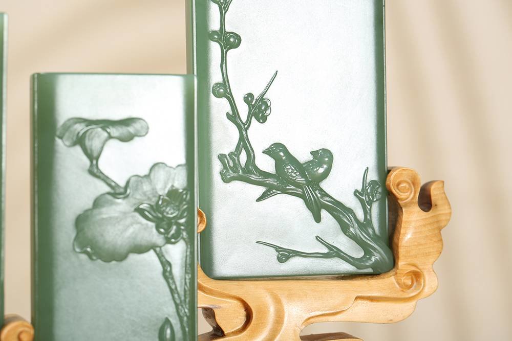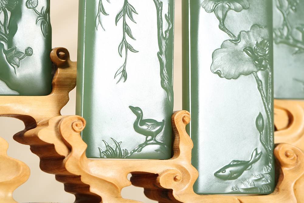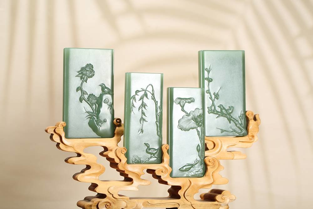 法古今变,前无古人,形制规整的四块玉牌,两大两小,取材优渥,玉色隽永,琢柳、荷、菊、梅,寄喻四季,以浅浮雕、梳毛等多元玉艺展现刚柔并济的设计线条,巧妙的打磨工艺,带来微妙的磨砂感,有种老照片般的年代感,四枚玉牌错落有致,相映成美,观之满目清韵。