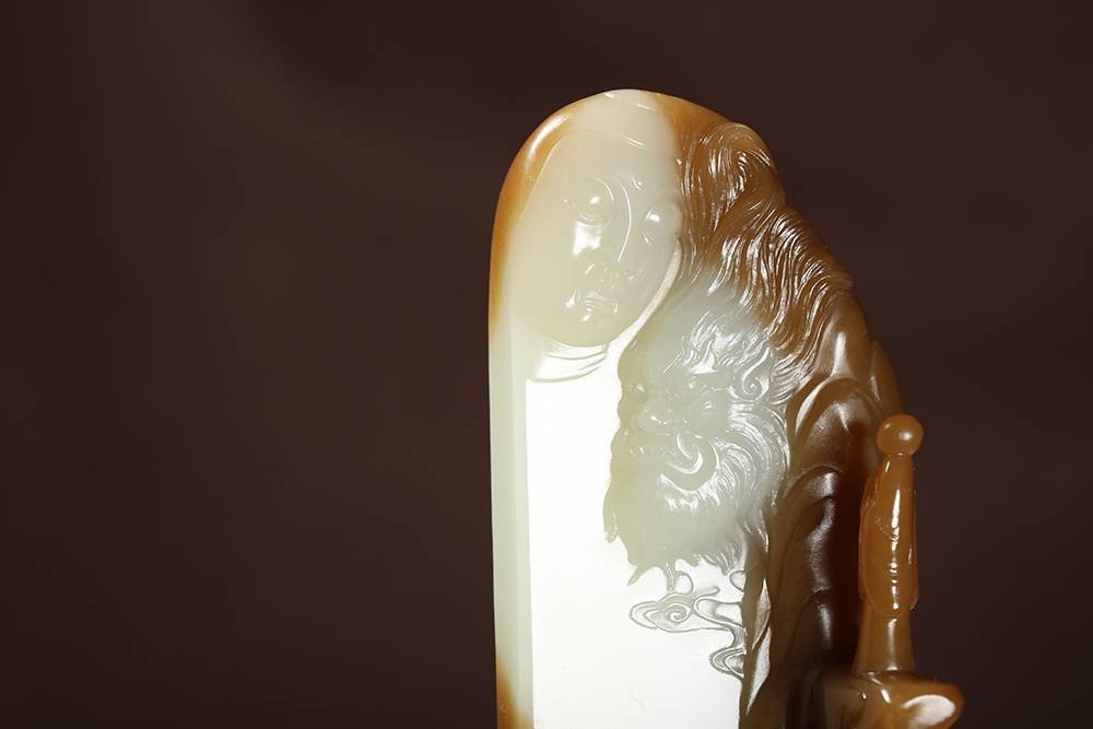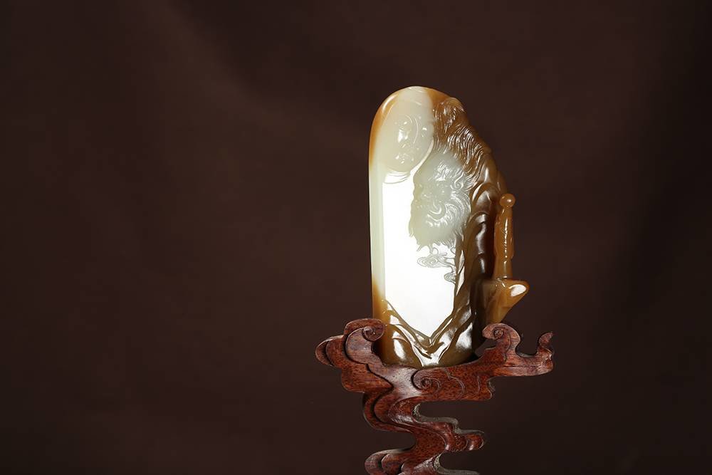 优质糖料,糖白分明,脂粉白肉雕琢佛与魔,随后依据糖色分布雕琢出整体山水之形,背部点缀些许卷云纹,立于侧面的小人仿若置身世外的求道者,一念清醒,一念糊涂,悟道之中,一念成佛,一念成魔。