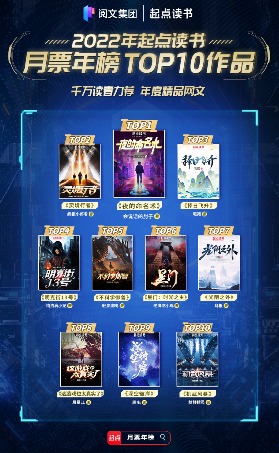 鞭牛士报道 1月3日,阅文旗下的起点读书公布2022年月票年榜前十,《夜的命名术》以225W+票稳居榜首,打破起点单月月票纪录,成为起点全站首部单月百万票作品。《择日飞升》《灵境行者》《不科学驭兽》等热门作品均在榜。