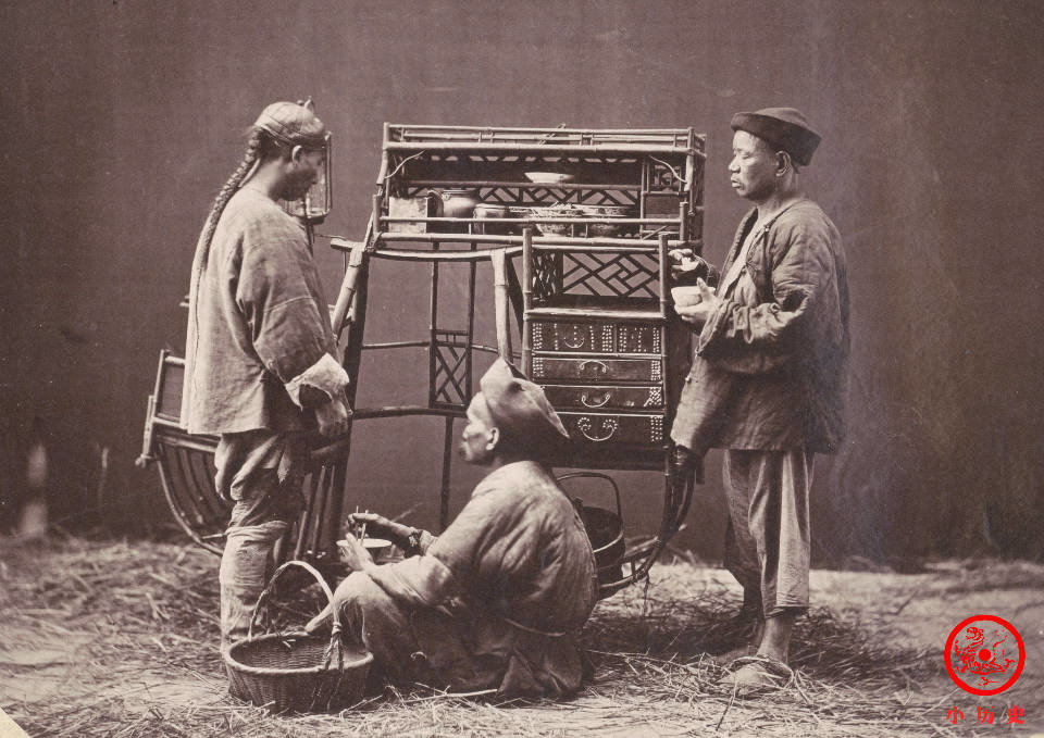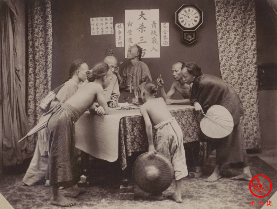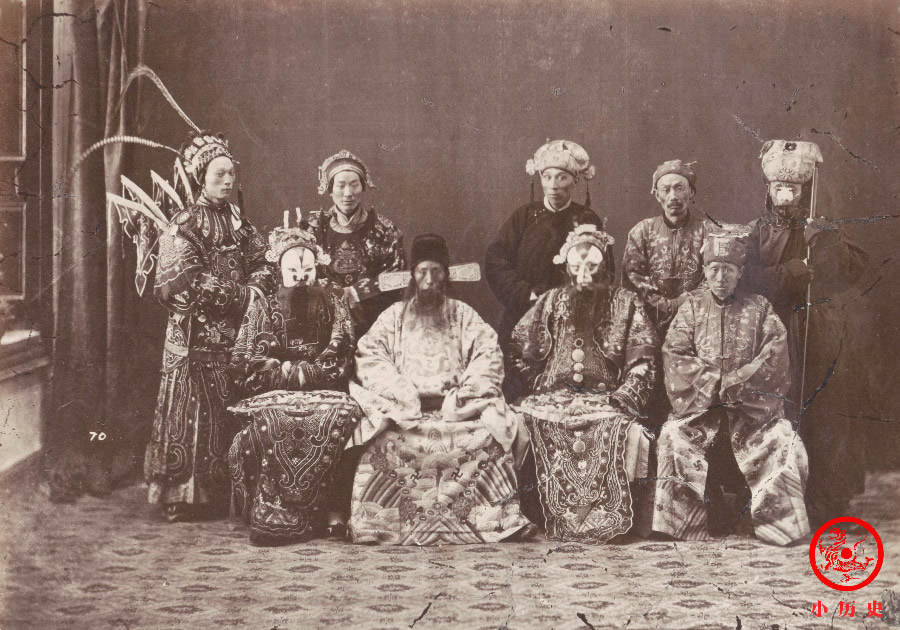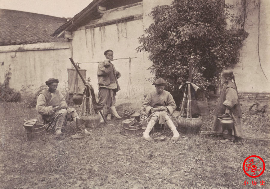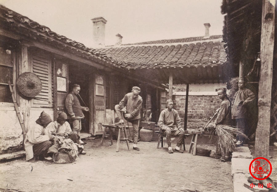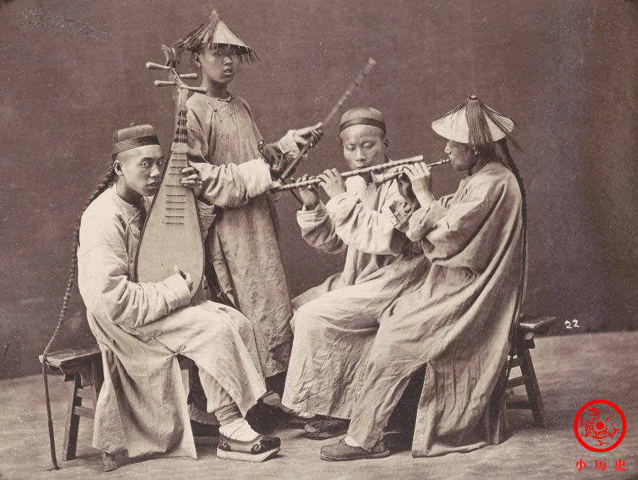 这张照片模拟了艺人的工作场景。有人吹笛子、有人吹唢呐、有人拉二胡、有人弹琵琶,个个都很投入。那个年代,专业艺人社会地位低下,传统上属于“贱籍”,雍正帝即位后允许他们脱籍,但实际上并没有改善他们的社会地位。
