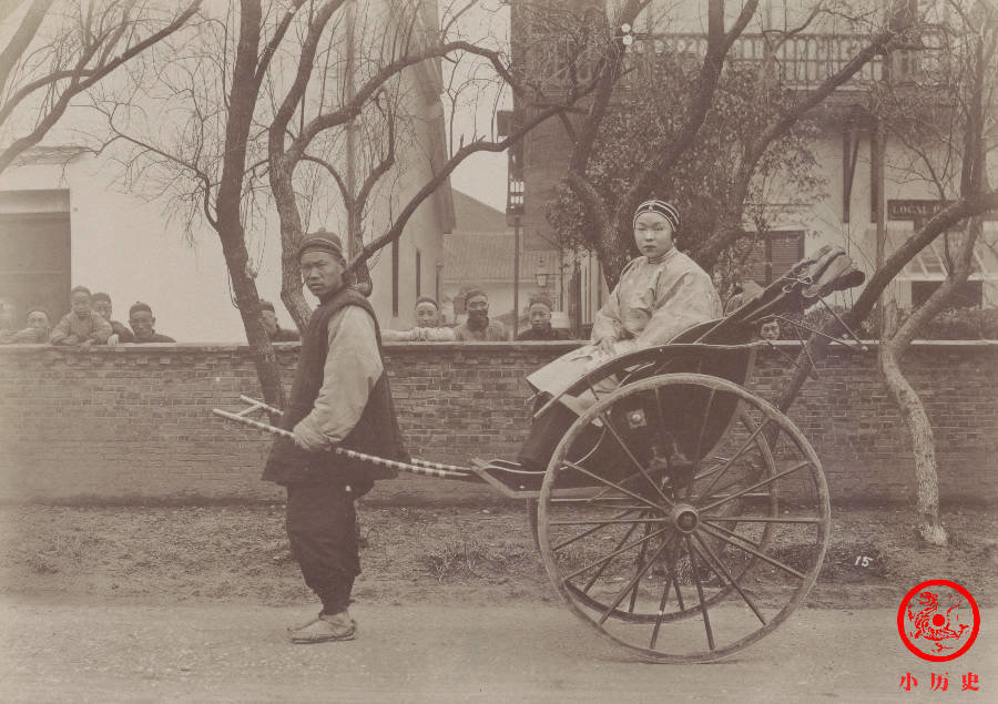 穿草鞋的人力车夫拉着一位尊贵的妇女,两人可能都是摄影师特意找来的。拍照时,墙外面很多人看热闹,他们并不在摄影师的设计之内,那个年代,见一次照相机并不容易,能被拍下来更是机会难得。