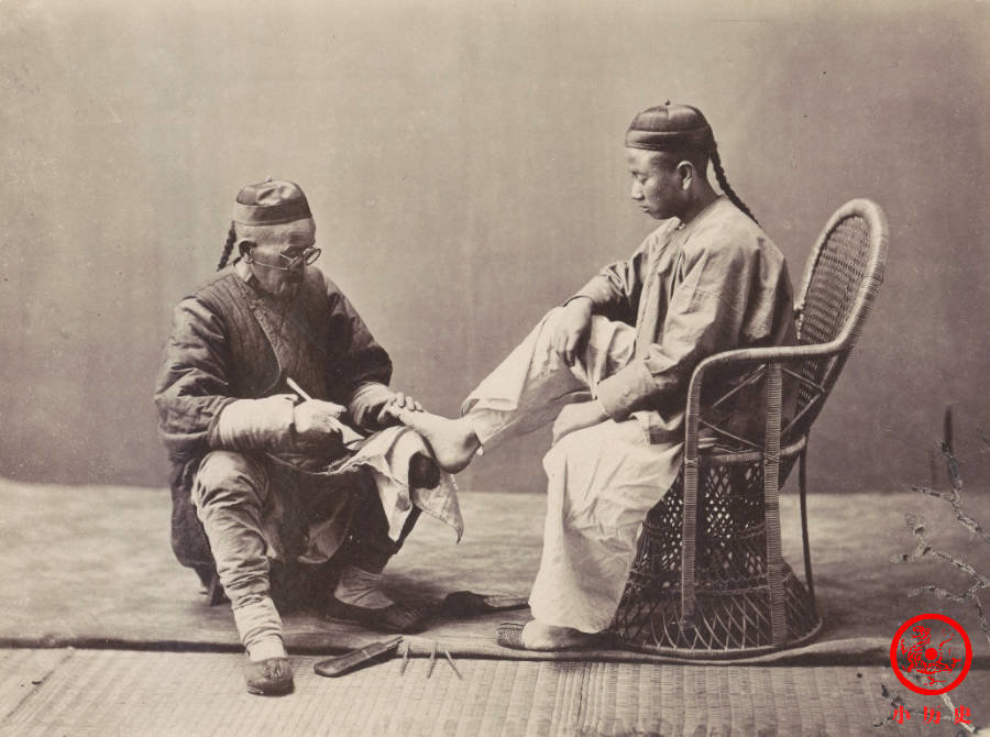 这种摆拍,就是为了介绍一个行当。旧时代,在北方,修脚行话叫“剜窝的”,大概他们的主要工作是挖鸡眼,因此得名。他们裹着几把修脚刀、一块白布,就能在街头揽活了,除了挖鸡眼,还能修趾甲、刮脚气、去老茧、做脚部按摩等等,是一个技术活,如果技艺不精,可能被顾客斥为“腥活儿”,意即糊弄人。