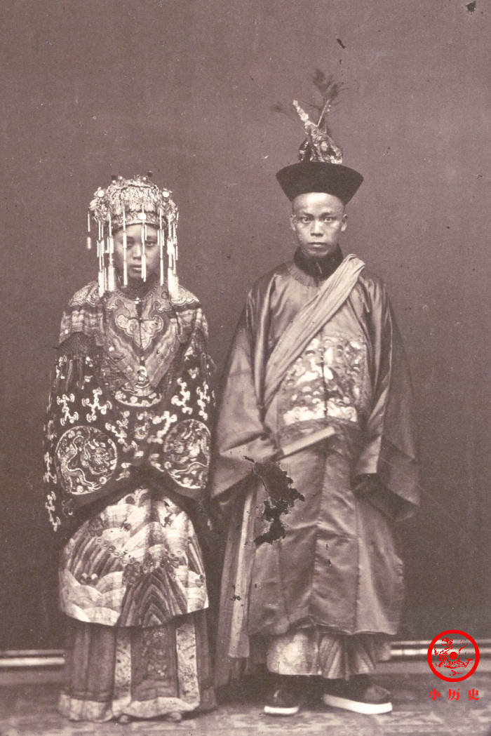由于是摆拍,这两人到底是不是新婚、是不是夫妻关系不得而知,他们所展示的婚礼服却是真实的晚清民俗。娶亲俗称“小登科”,新郎哪怕是普通男子,也被允许穿青绿色九品官服;新娘穿大红婚服,上衣下裳,凤冠霞帔,服制类似九品命妇。