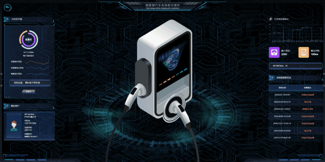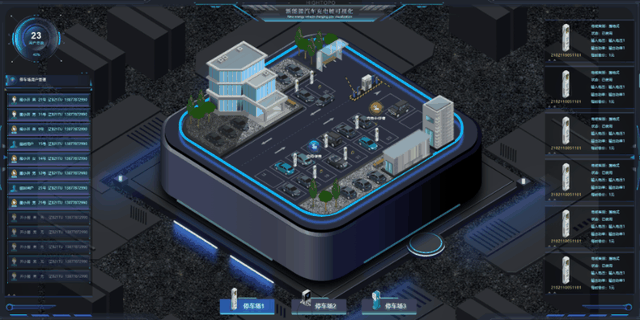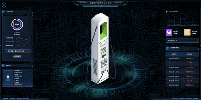 图扑软件 HT 数据可视化平台以充电站的充电桩等相关设备为可视化对象,基于三维沉浸式实体建模和信息数据的虚拟仿真技术,通过大屏幕互动,实现多功能充电站设备运行和充电服务的沉浸式全方位可视化监控,并利用 Web3D 技术实现对象数据的远程实时浏览。