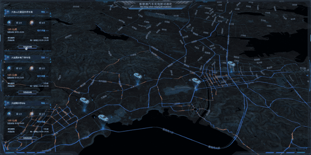 初始页面场景设置了以新能源汽车载入的风格。并选用醒目的高亮流光效果,聚焦视野至关键交通枢纽。结合 GIS 地图,以城市地图为背景,辅以 2D 面板进行可视化展示。分别从充电管理、告警管理、智慧路线规划等层面,对充电站运营进行优化整合,全方位掌控停车场运行状况,及时做出运营策略调整。