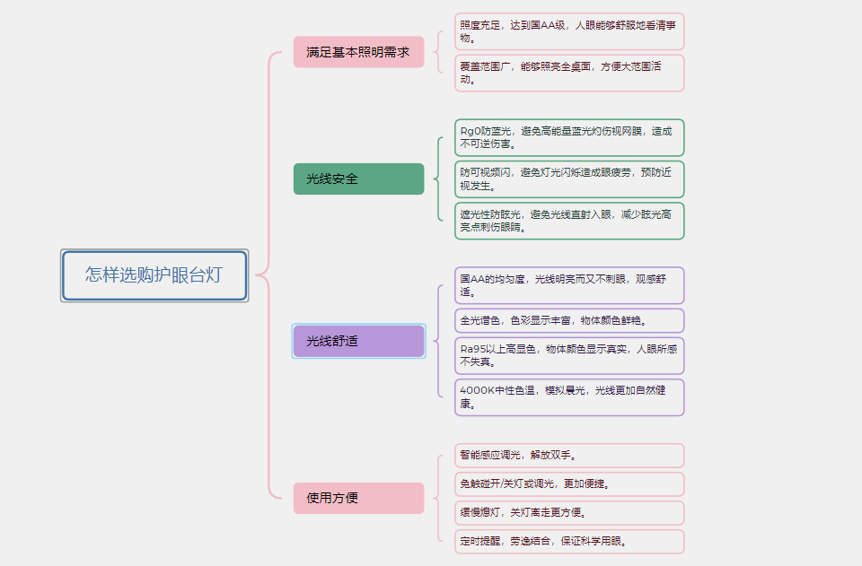 可以从基本照明需求、安全性、舒适性、便捷性等各方面去考虑。照明需求上讲求光线明亮,照明范围广,同时也还有不刺眼,所以得照度和均匀度都同时达标才行,这里有国家标准AA级和A级做参考,认准最好的国AA就行。