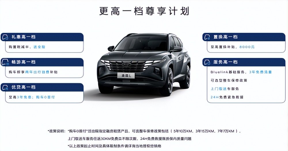 不止于产品,途胜L 8AT更从销售政策入手给到消费者最大诚意。在途胜L 8AT最新一版的销售政策中,虽然2022年底国家对部分燃油车购置税减半政策就已经结束,但北京现代依旧自掏腰包提供该优惠,并送千元全险;此外还有两年出行油费补贴、最高8000元置换补贴等优惠,感兴趣的朋友现在就可以前往北京现代门店进行咨询。