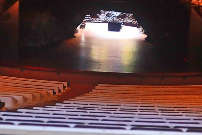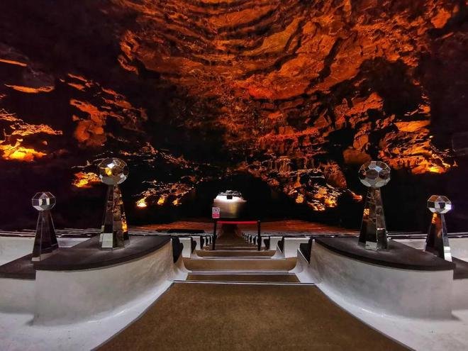 塞萨尔是一个艺术家,并不是建筑师,但他总能顺应自然的起伏,创造出建筑的奇迹,在另外一个火山的肚子里,居然孕育出了一个天然礼堂,具有大自然赋予的非凡音响效果,坚毅的玄武岩,温润的反射着歌者吟唱,乐队丝弦,座椅也一点不任性,顺从火山熔浆的自然坡度。