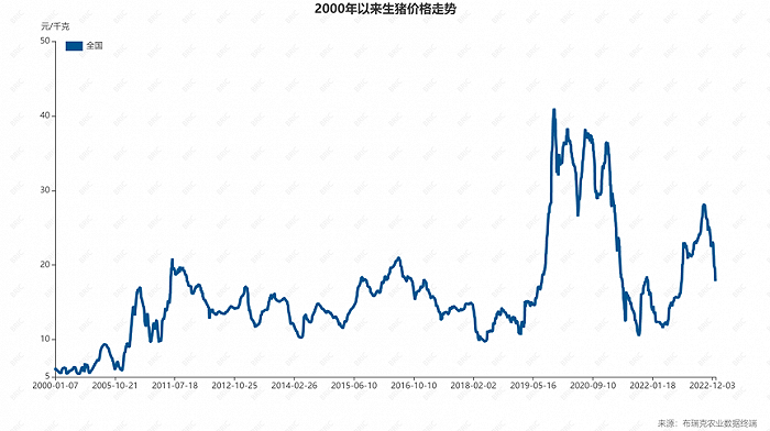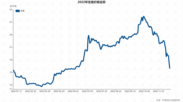 2022年,是猪价波动幅度约达300%的一年。布瑞克农业大数据报告显示,2022年1月1日至2022年12月20日,全国生猪均价最低为11.5元/公斤,最高28.5元/公斤,均价波动幅度在245%左右。而部分地区今年猪价最低出现10.8元/公斤,最高时则可达30.5元/公斤。