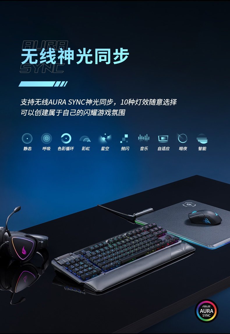 灯效方面,这款键盘支持无线神光同步,你可以通过无线 AURA SYNC 神光同步使用 10 种灯效,还可以创建属于自己的闪耀游戏氛围。