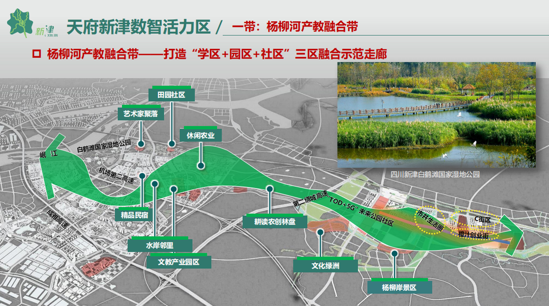 一带——杨柳河产教融合带:打造“学区+园区+社区”三区融合示范走廊。依托牧马山—杨柳河良好生态本底,打造杨柳河滨河生态带,串联成都艺术职业大学、成都职业技术学院、新华职业教育等在地高校创新创业资源,联通数字经济和智能制造两大产业板块,沿岸布局西南交大TOD+5G联创中心、产教融合5G电商直播基地等创新机构,配套高品质生活社区和公共服务,植入消费、休闲、游憩等应用场景和在地文化,缝合城市片区、修复城市生态、优化城市功能,促进知识和人才汇聚、产学研用协同创新。