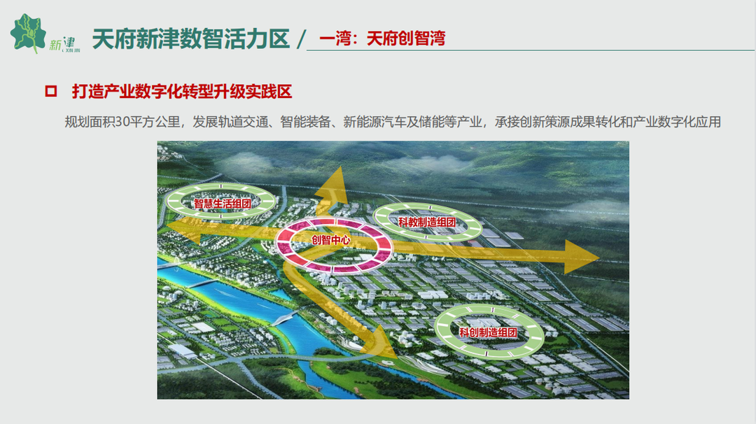 一湾——天府创智湾:打造产业数字化转型升级实践区。重点发展轨道交通、智能装备、新能源汽车及储能等产业,承接创新策源成果转化和产业数字化应用。联合中国联通集团打造天府创智汇,突出工业控制、智能家居、智能穿戴、物联网、5G与机器人等领域,孵化中小微企业和初创团队。联合天府新区打造天府先进智造产业基地,聚焦智能装备、智能硬件等细分产业,共建“科技研发+成果转化+产融结合”产业基地。联合高新区打造天府智能硬件产业园,聚焦智能硬件、智能装备及工业互联网细分产业,共建“孵化培育+产业加速+产融结合”产业园。