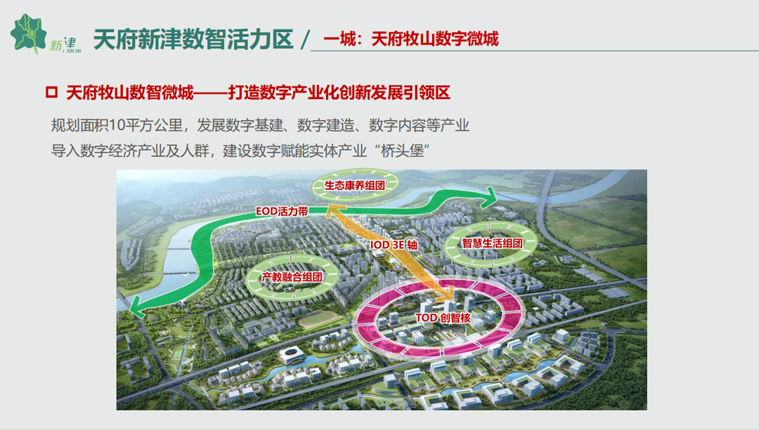 一城——天府牧山数智微城:打造数字产业化创新发展引领区。重点发展数字基建、数字建造、数字内容等产业,导入数字经济产业及人群,建设数字赋能实体产业“桥头堡”。布局智能创新产业集聚核,打造数字经济产业载体,聚集数字经济企业。布局智慧公园城市场景沉浸轴,打造E商坊(智慧办公)、E园坊(智慧游憩)、E英坊(智慧社区)。布局智慧生活组团,实施“TOD+5G”综合开发,打造“通勤圈、商业圈、生活圈”相互支撑的站城一体、职住平衡、精明增长产城单元。