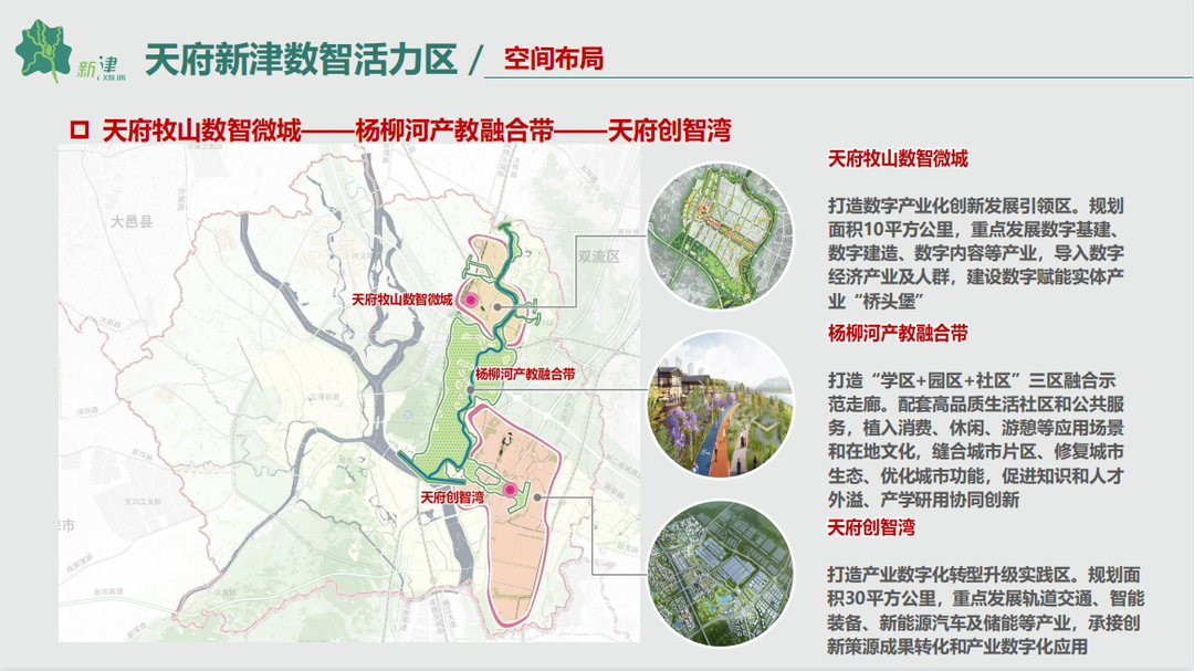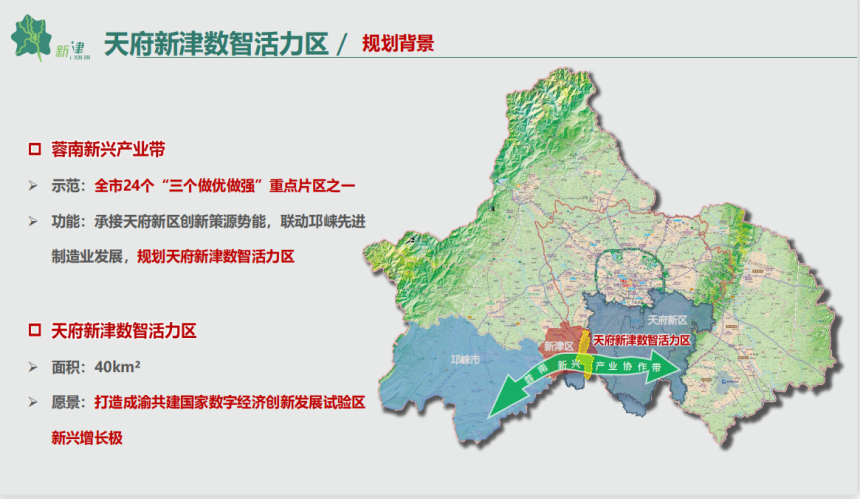 围绕共建蓉南新兴产业带,新津区承接天府新区创新策源势能,联动邛崃先进制造业发展,规划以“一城一带一湾”为空间布局的天府新津数智活力区,加快推动形成多中心、组团式、网络化发展格局。