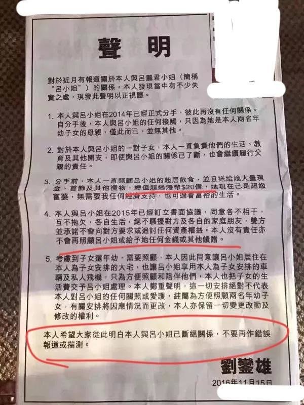 刘銮雄在与吕丽君分手时,为了杜绝后患,甚至把他与吕丽君生的两个孩子的继承权都剥夺了。