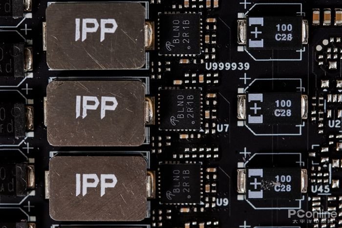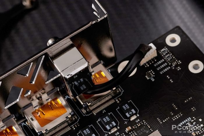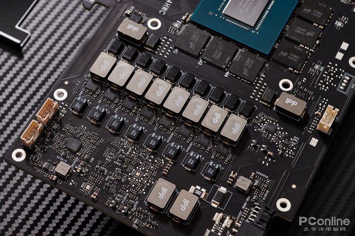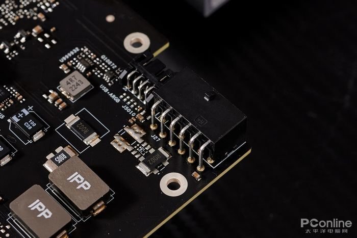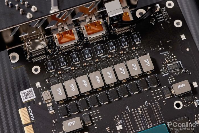 PCB的右上角是12VHPWR供电接口,附近也有两颗I.P.P至纯供电电感保障电流稳定。