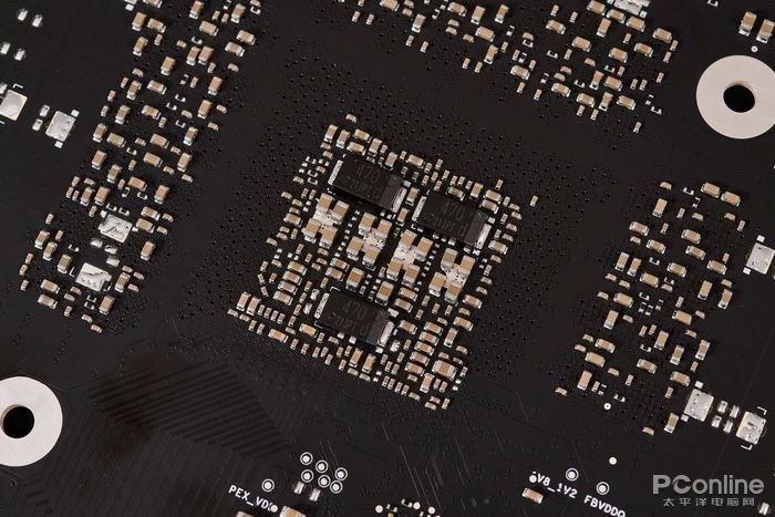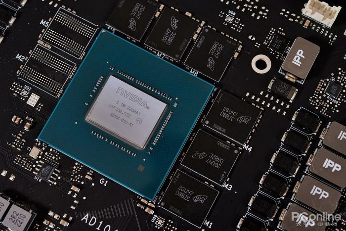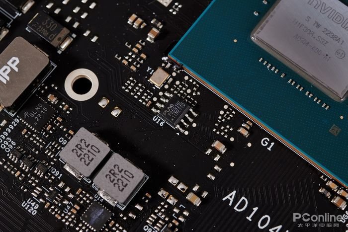 其中AD104核心背部的电容位置使用了三个POSCAP(导电聚合物钽电容),电气性能会更强一些。